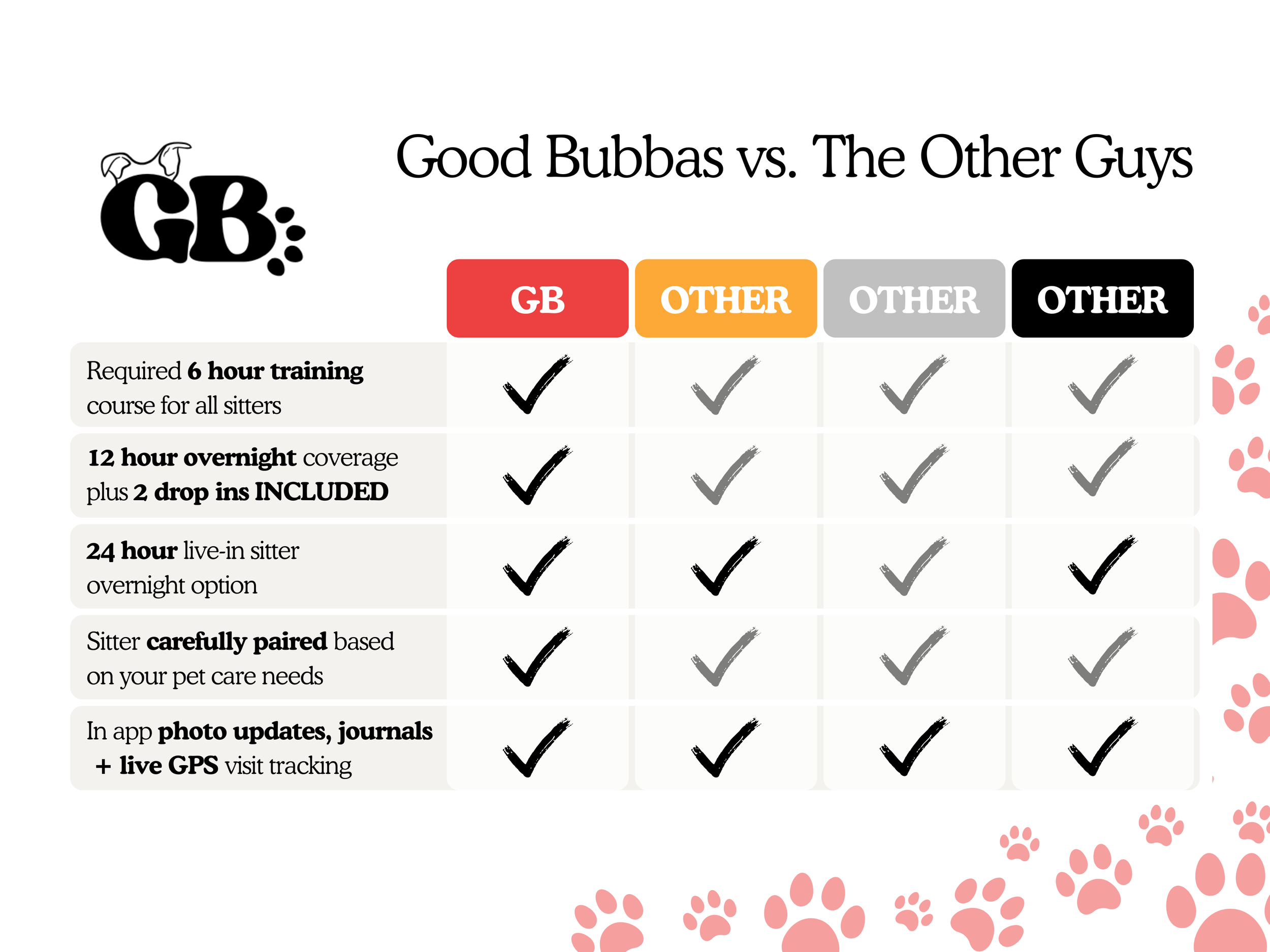 At Good Bubbas, our mission is simple: to love our client’s pets like they’re our own! We believe every tail wag, purr, and happy zoomie deserves extra care and attention. With a mix of reliability, belly rubs, and a whole lot of fun, we’re here to make sure your furry best friends feel safe, loved, and downright spoiled while you’re away. Because at Good Bubbas, every pet is a good bubba.
